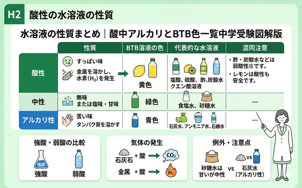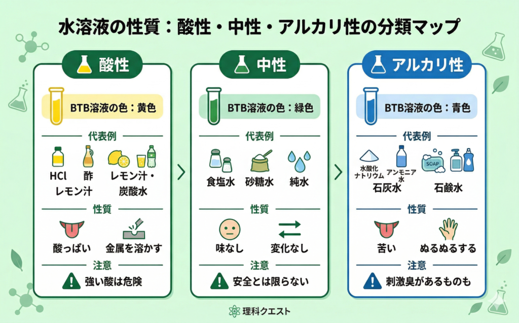 砂糖水・食塩水・アルコール(エタノール)は中性。水溶液の性質は酸性・中性・アルカリ性に分け、BTBは酸性=黄、中性=緑、アルカリ性=青。代表例と危険な水溶液の注意も表で確認します。