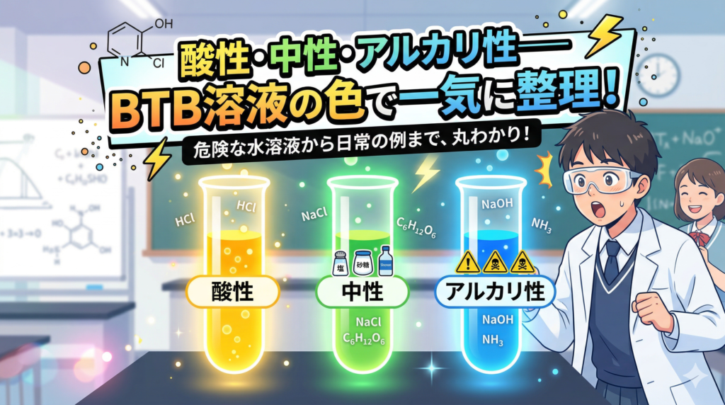性質そのものは暗記が必要ですが、BTB溶液の色の変化や、日常生活でのイメージとセットで覚えるとずっと楽になります。