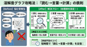 | 解き直し | 取りこぼしを「結果不足」「空気の変化不足」「因果不足」に分類して書き直す | 同じ原因によるミスが続かない |