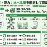 2026年1月22日 / 最終更新日 : 2026年3月3日 wpmaster 圧力・水圧・浮力が混乱→比べる量(面積/深さ/体積)を整理して解く 中学受験理科/物理 テーマ:圧力・水圧・浮力は「比べる量」を一定にして混乱を止める 悩み起点 比べる量の整理 条件→図→式の順を一定にする 家庭で回す 同じ水の中なのに、どちらが圧力が大きいのかで戸惑う。 水圧の問題で「 […]