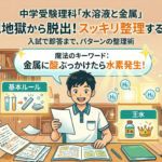 2023年3月23日 / 最終更新日 : 2026年4月22日 wpmaster 金属を溶かす水溶液一覧|酸・アルカリ・王水【理科のコツ】 中学受験理科/化学分野 水溶液と金属の反応・暗記のコツ 中学受験理科「水溶液と金属」の勉強法──暗記一色の単元を整理して覚えるコツ 金属を溶かす水溶液はどれか、まず一覧で整理します。 金属+酸で水素が出る基本、銅銀金の例 […]