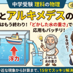 2023年3月16日 / 最終更新日 : 2026年4月22日 wpmaster 浮力とは?公式と求め方|密度で浮く沈むも整理【理科のコツ】 小5〜中1/浮力・アルキメデスの原理 読み時間目安:8〜12分 浮力とは、液体や気体の中で物体を上向きに押す力です。 求め方の基本は、空気中の重さ − 水中の重さです。 さらに、アルキメデスの原理「どかした液体の重さ=浮 […]