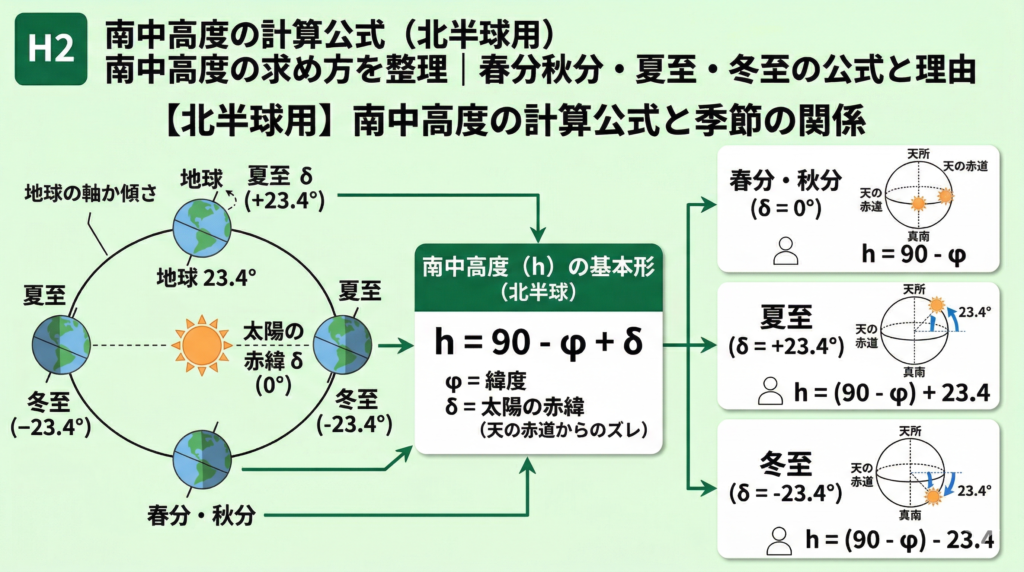 | 時期 | 南中高度の公式(北半球) | ポイント |