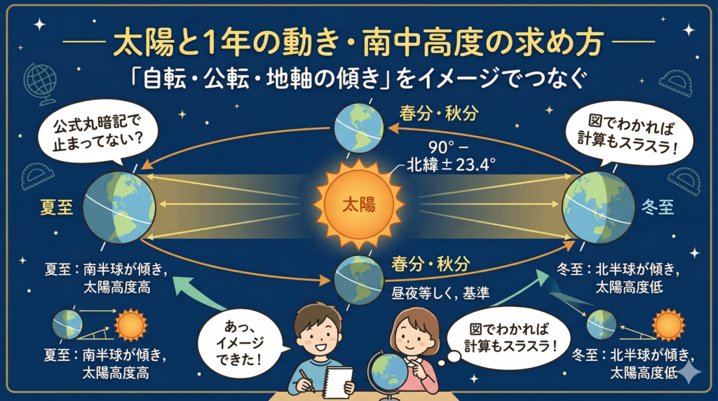 太陽と1年の動き・南中高度の求め方──「自転・公転・地軸の傾き」をイメージでつなぐ