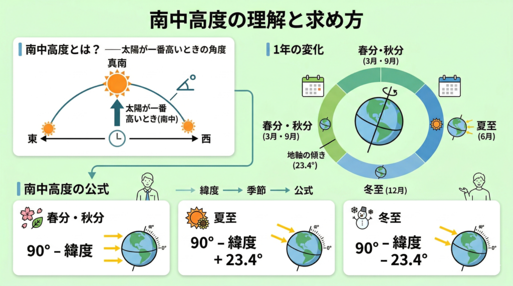 南中高度の計算で式を選べず迷うのは、春分秋分を基準にした23.4°の意味がつながっていないから。緯度と季節から、夏至は足す・冬至は引く理由まで整理します。